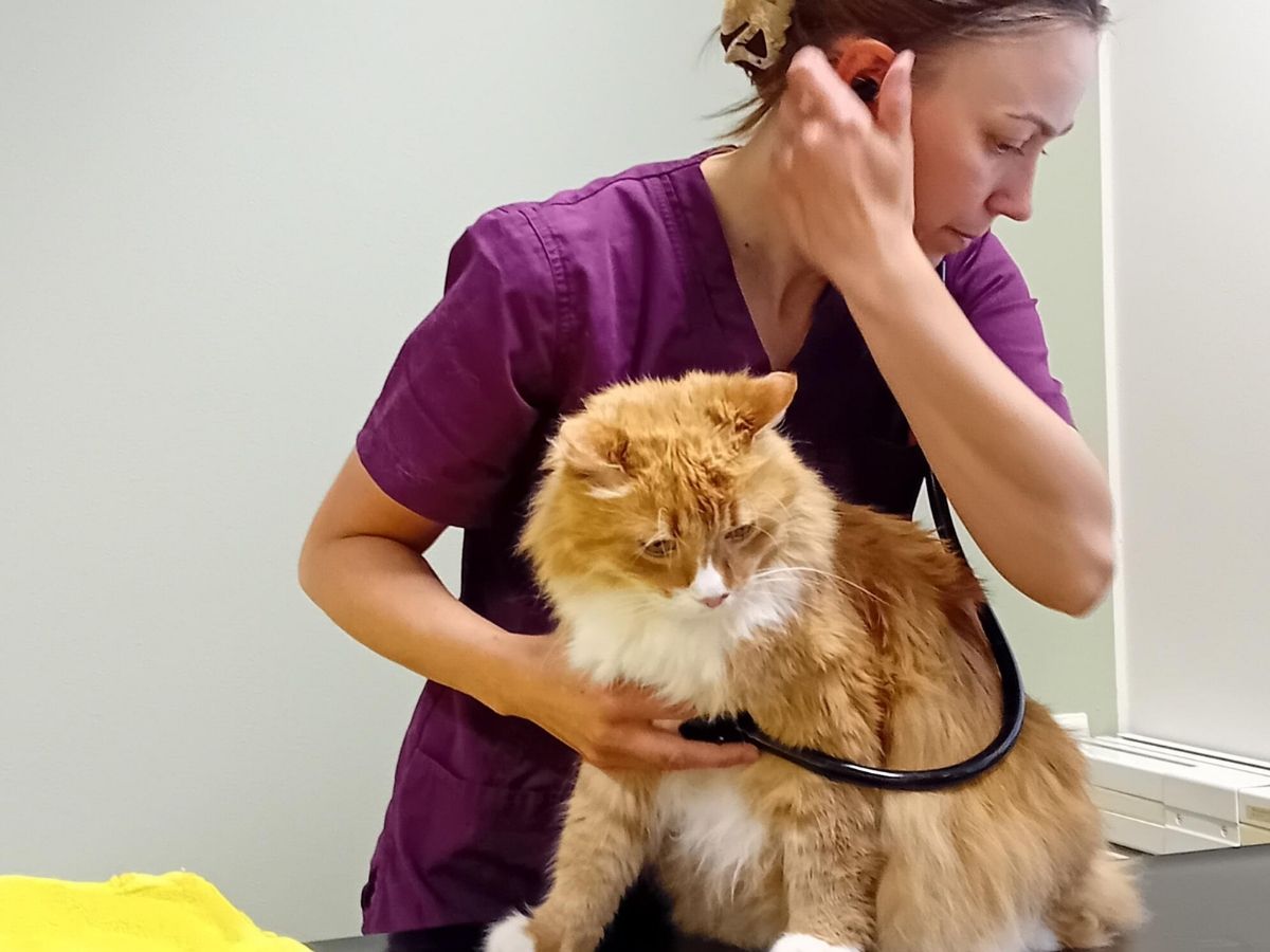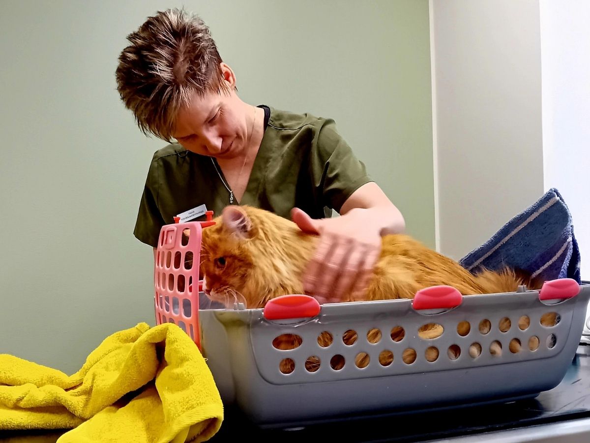 Hetken päästä eläinlääkäri Mathilda Ylenius tuli huoneeseen. Yhdessä Heidin kanssa hän avasi kuljetuskopan ja he tutustuivat potilaaseen. Alfredia rauhoiteltiin silittelyllä ja rauhallisesti puhumalla. Lemmikille vieras paikka ja uudet hajut aiheuttavat usein stressiä, joten lähestyminen ja luottamuksen saaminen vievät aina jonkin verran aikaa.